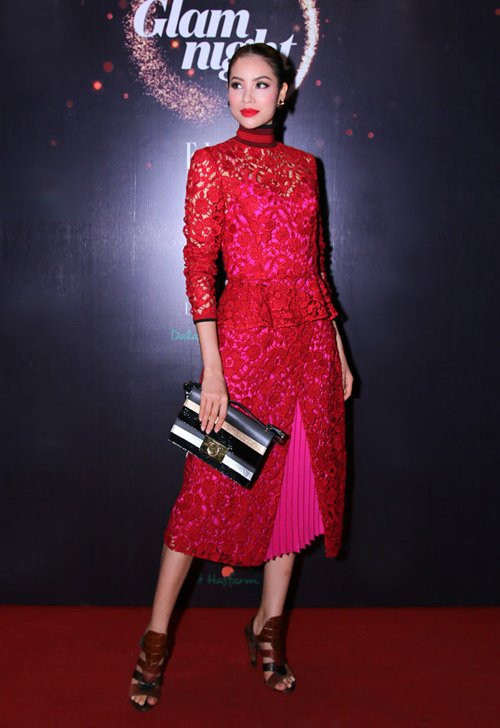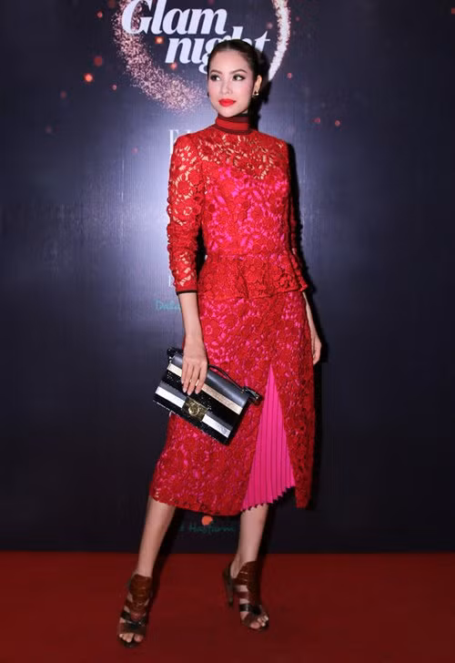 Đặc biệt, ngày 16.1 vừa qua, cô gây chú ý với chiếc váy ren đỏ của thương hiệu Salvatore Ferragamo với mức giá lên tới hơn 100 triệu đồng. Cùng với phụ kiện thắt lưng, và túi xách, tổng giá trị “cây” hàng hiệu của cô có giá hơn 200 triệu đồng.