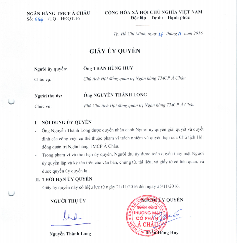 Trở lại với câu chuyện thỏa thuận cổ phiếu khối lượng khủng ở ACB, có một chi tiết trùng hợp khá thú vị là ngay trước giai đoạn diễn ra các giao dịch sôi động này, Chủ tịch HĐQT ACB – ông Trần Hùng Huy, đã ký Giấy Ủy quyền, ủy quyền cho ông Nguyễn Thành Long (Phó Chủ tịch HĐQT) được quyền nhân danh mình giải quyết và quyết định các công việc cụ thể thuộc phạm vi trách nhiệm và quyền hạn của Chủ tịch HĐQT Ngân hàng TMCP Á Châu.