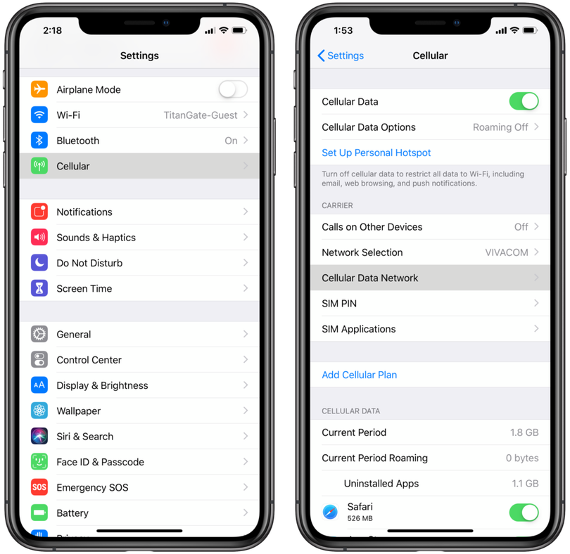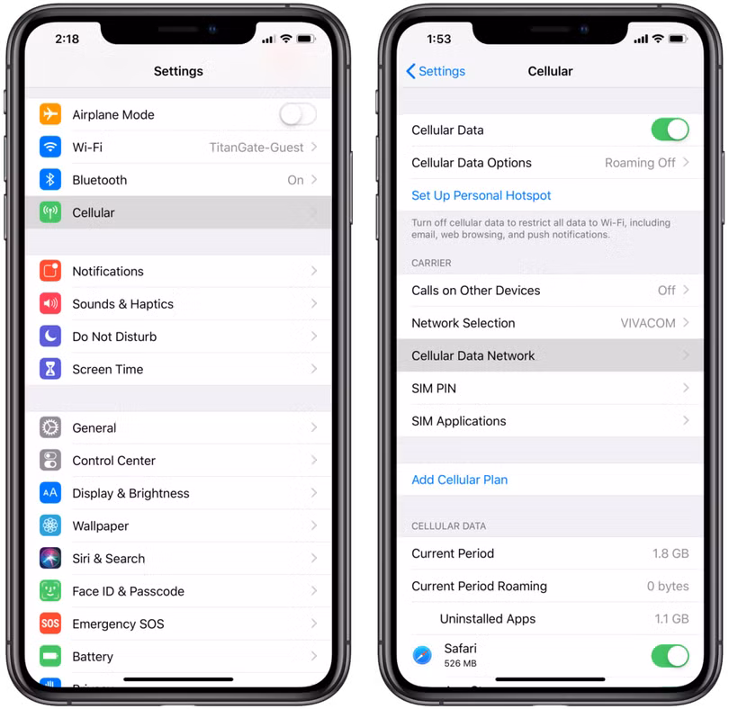 Bạn truy cập vào mục Cellular > Cellular Data Network