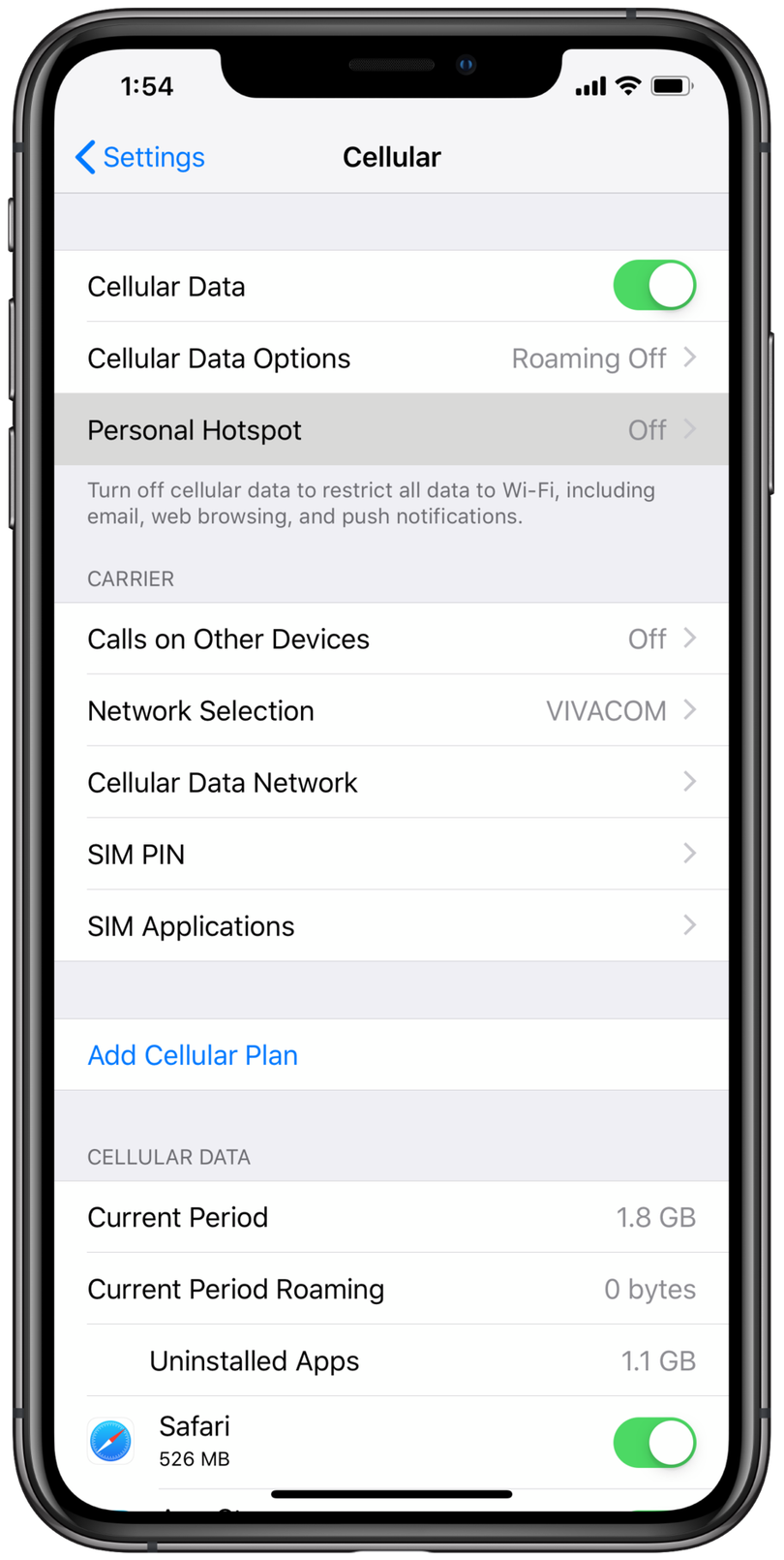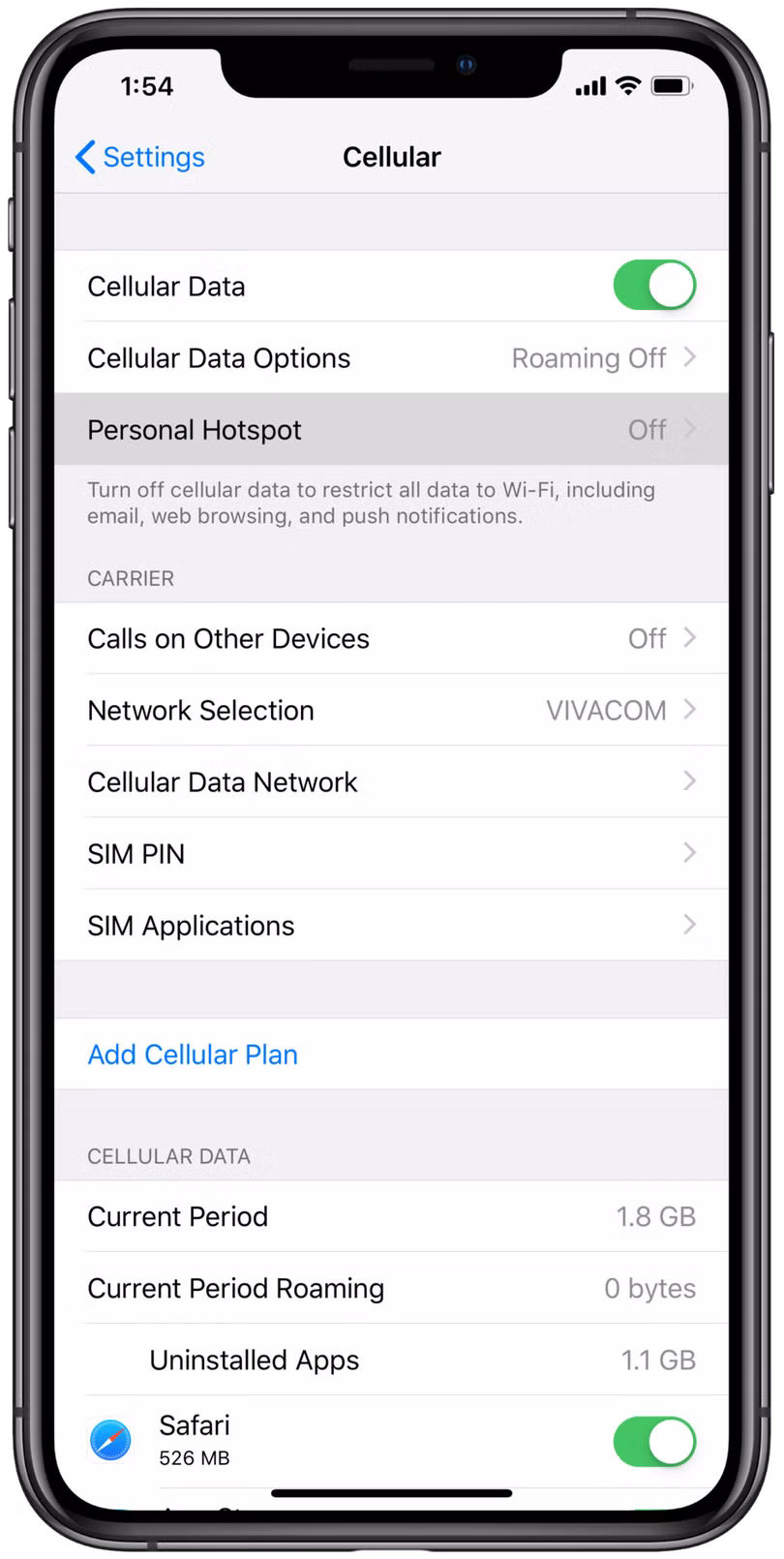 Quay lại mục Cellular. Lúc này bạn sẽ nhìn thấy một thanh Personal Hotspot mới xuất hiện. Bấm chọn nó