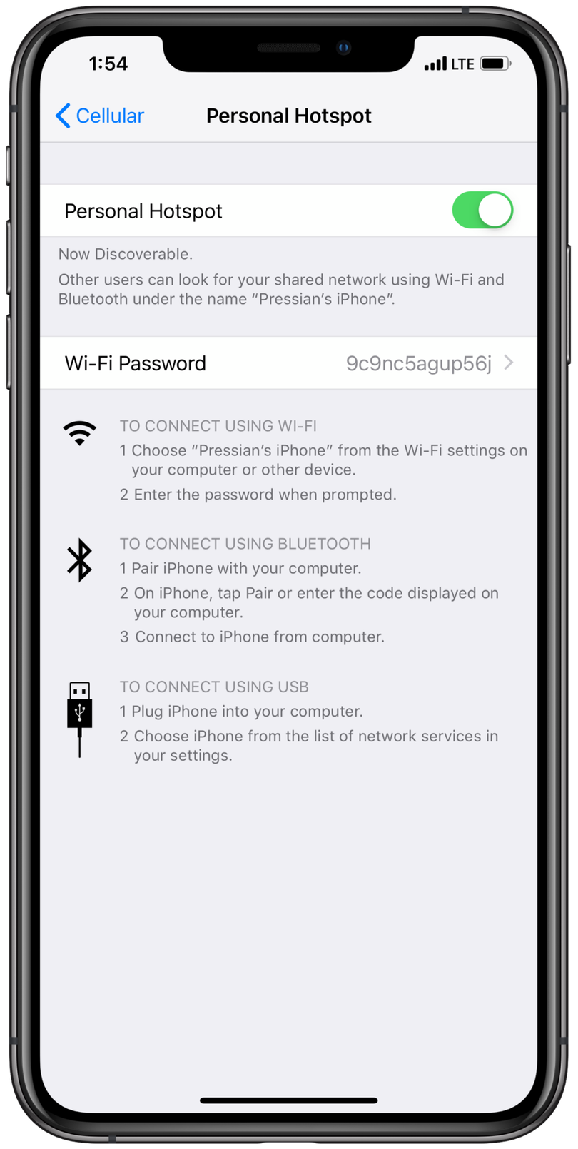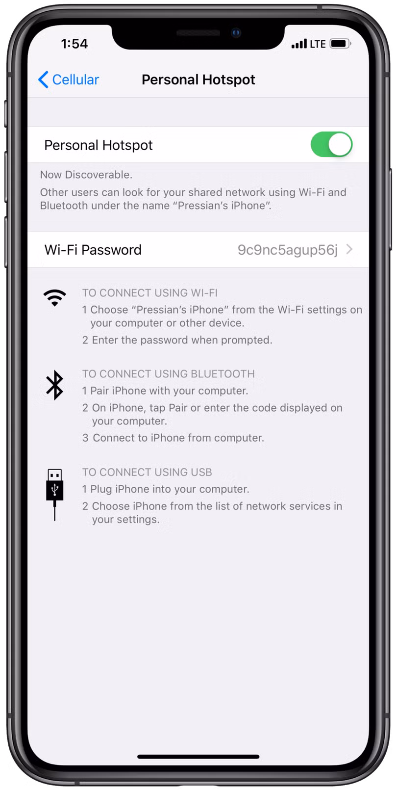 Kéo núm trượt Personal Hotspot sang màu xanh. Bây giờ điện thoại của bạn đã trở thành điểm phát Wi-Fi và các thiết bị khác có thể kết nối thông qua mật khẩu được tự động sinh ra ở phần Wi-Fi password (hình dưới)