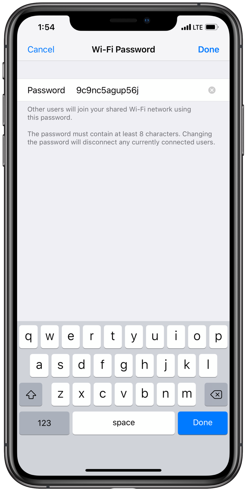 Nếu bạn thấy mật khẩu kết nối quá rắc rối và khó nhớ, bạn có thể đổi mật khẩu này bằng cách bấm vào dấu x để xóa mật khẩu cũ, sau đó gõ mật khẩu mới và bấm Done.