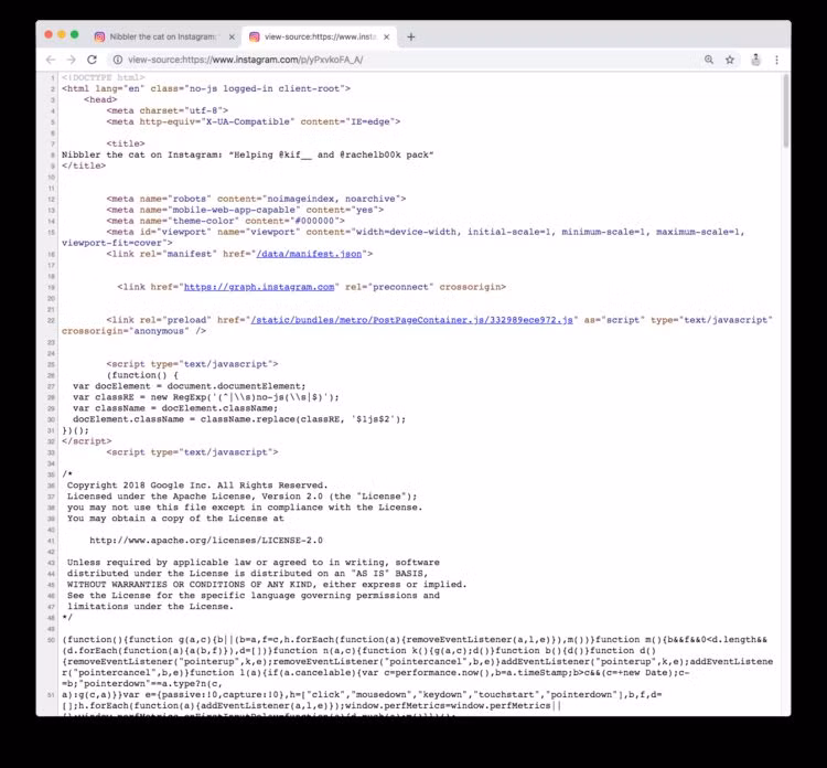 Bạn cần phải xem mã nguồn HTML của trang Instagram này. Đừng lo, nó không khó lắm đâu. Đối với trình duyệt Chrome, bạn hãy bấm vào View > Developer > View Source (trình duyệt Firefox, Microsoft Edge hay Safari cũng cho phép xem mã nguồn).