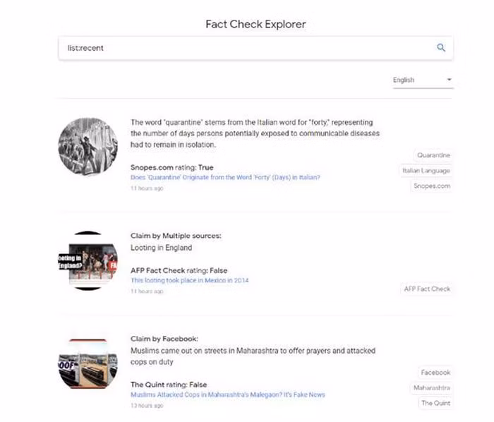 Bạn có thể dùng thử bằng cách tìm kiếm từ khóa từ một bài báo hoặc cá nhân mà bạn đang điều tra. Công cụ sau đó sẽ cho bạn biết tin tức có phải là giả hay không dựa trên kết quả điều tra được thực hiện bởi các trang web kiểm tra khác.