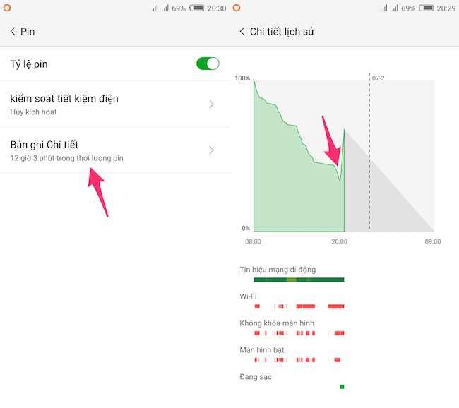 Tại đây sẽ có một biểu đồ nhỏ thể hiện tình trạng sử dụng pin, phần bạn cần quan tâm chính là On Screen (màn hình bật), nếu khoảng thời gian này thấp hoặc biểu đồ có sự sụt giảm bất thường thì nhiều khả năng đang có phần mềm chạy ngầm trên smartphone.