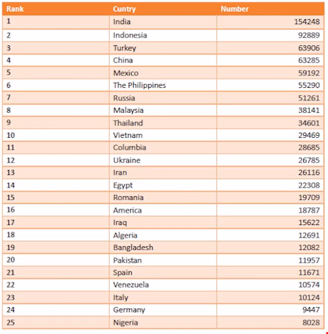Theo thống kê, trojan Hummer có tốc độ lây lan rất nhanh trên khắp thế giới, đặc biệt ở những nước như Ấn Độ, Indonesia, Thổ Nhĩ Kỳ và Trung Quốc. Dưới đây là danh sách 25 quốc gia hàng đầu bị ảnh hưởng bởi các biến thể trojan Hummer trong sáu tháng đầu năm 2016, trong đó Việt Nam đứng ở vị trí thứ 10 với gần 30.000 thiết bị Android bị lây nhiễm.