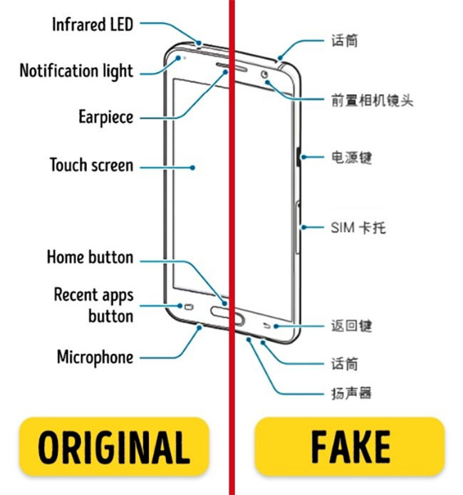 Tất cả các phông chữ và biểu tượng trên thiết bị phải trơn tru, dễ đọc và bền. Những trường hợp với hàng giả thường thiếu tên của nhà sản xuất hoặc bằng cách nào đó sai thiết kế.