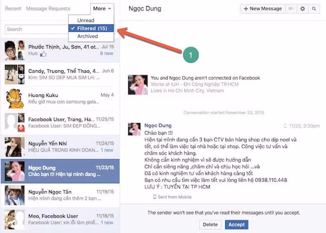 Để truy cập vào hộp thư bí mật trên smartphone, bạn hãy mở ứng dụng Messenger, chọn Settings > People > Message Requests > See filtered requests. Nếu đang sử dụng máy tính, người dùng chỉ cần kích vào biểu tượng trò chuyện, nhấn See All > Message Requests ở góc trên bên trái, hoặc nhấn More và chọn Filtered.