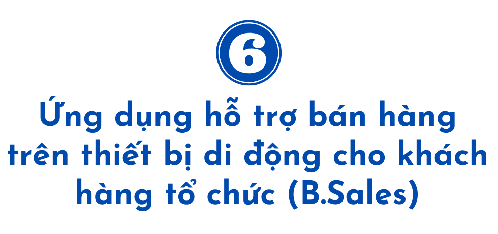 Ứng dụng hỗ trợ bán hàng trên thiết bị di động cho khách hàng tổ chức (B.Sales) sẽ cung cấp cho chi nhánh công cụ hỗ trợ triển khai bán hàng chủ động, góp phần tăng tỷ lệ bán chéo và hiệu quả bán chéo. Chương trình cung cấp các thông tin về sản phẩm dịch vụ; thông tin về chương trình khuyến mại; thông tin về cơ chế động lực, ấn phẩm marketing, cơ chế chính sách theo từng phân khúc khách hàng doanh nghiệp; thông tin về biểu phí, lãi suất, tỷ giá chung toàn hệ thống.
