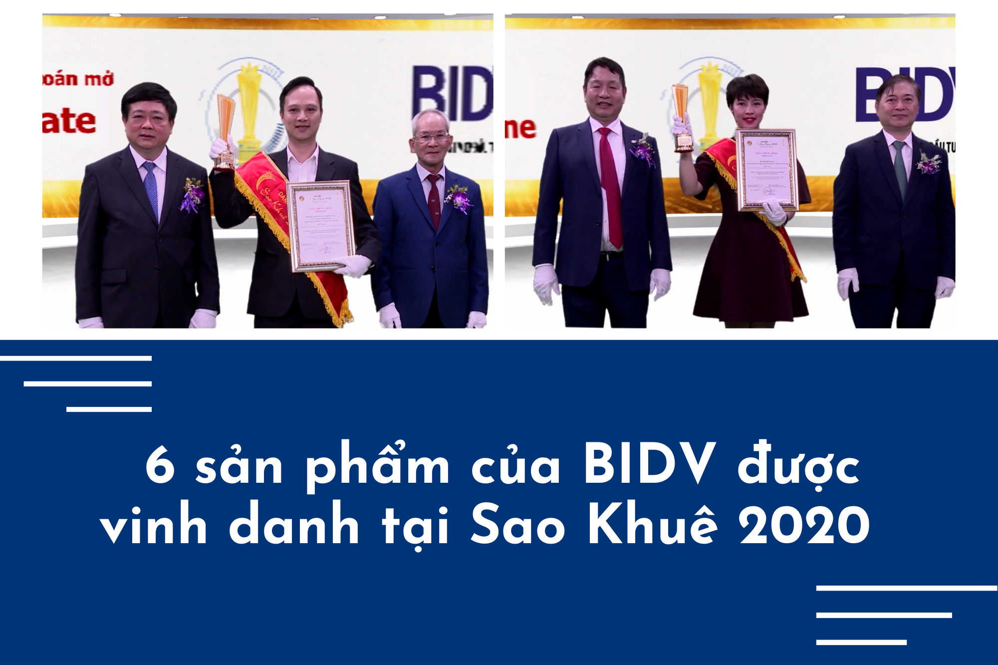 | Năm 2020 là lần thứ 8 (kể từ năm 2011) BIDV tham gia và đều nhận được danh hiệu Sao Khuê cho các sản phẩm tham dự với tổng cộng 18 danh hiệu. Ngoài 06 sản phẩm được vinh danh năm 2020, trong các năm trước đó, BIDV đã có 12 sản phẩm dịch vụ ứng dụng công nghệ thông tin xuất sắc được trao danh hiệu Sao Khuê: - Hệ thống Cổng thanh toán trực tuyến với các công ty chứng khoán BIDV@SECURITIES; - Phần mềm Thanh toán hóa đơn online; - Phần mềm Cổng trao đổi thông tin nộp thuế điện tử của BIDV; - Sản phẩm Ứng dụng xử lý điện chuyển tiền nhanh từ các ngân hàng khác tới BIDV - IMAP; - Sản phẩm BIDV HomeBanking; - Phần mềm Đăng ký dịch vụ trực tuyến; - Phần mềm Quản lý hóa đơn của BIDV; - Hệ thống Giao dịch ngân hàng điện tử cho khách hàng tổ chức (BIDV iBank); - Hệ thống Quản lý định danh BIDV (BIDV IDM); - Ứng dụng công nghệ tự động hóa quy trình bằng robot (Robotic Process Automation - RPA) trong nghiệp vụ thanh toán theo bảng kê tại BIDV; - Chương trình Cổng thanh toán kiều hối cho khách hàng cá nhân; - Chương trình Quản lý doanh thu bảo hiểm BIC qua hệ thống BIDV (Bancassurance System Management - BSM). |