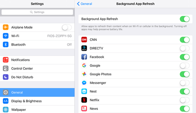 Hầu hết các ứng dụng được cài đặt trong máy đều có tính năng định kỳ tự động cập nhật ngầm các nội dung của nó. Việc này sẽ giúp bạn có được những thông tin, dữ liệu, tính năng mới nhất của ứng dụng mà không cần phải thao tác bằng tay. Tuy nhiên nó cũng là một tác nhân làm giảm thời lượng pin. Để kiểm soát, hãy vào “Cài đặt”> “Cài đặt chung”> “Làm mới ứng dụng trong nền” và tắt đi tính năng tự động này với những ứng dụng mà bạn thấy không thực sự cần thiết.