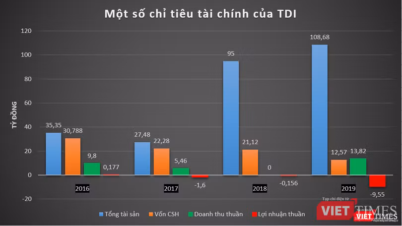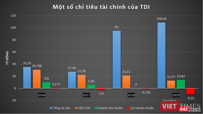 Trong giai đoạn 2016 – 2019, TDI chỉ báo lãi duy nhất vào năm 2016 với số tiền 177 triệu đồng. Các năm sau đó, từ 2017 – 2019, doanh nghiệp này lần lượt báo lỗ 1,6 tỷ đồng, 156 triệu đồng và 9,55 tỷ đồng.