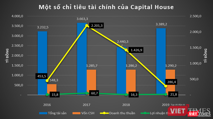 Năm 2019, doanh thu thuần của Capital House đạt 286,35 tỷ đồng, giảm gần 80% so với cùng kỳ năm trước; lãi thuần ở mức 21,8 tỷ đồng, trong khi năm 2018 chỉ lãi hơn 16 tỷ đồng.