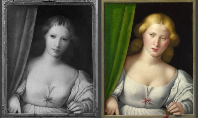 Bức họa này không rõ danh tính của họa sĩ, nó được lưu trữ trong Phòng trưng bày Quốc gia Luân Đôn. Vào năm 1978, bức tranh đã được gửi để phục hồi - một thủ tục thông thường cho những kiệt tác nghệ thuật. Tuy nhiên, trong quá trình các chuyên gia thủ tục phát hiện ra rằng có thêm một lớp dưới lớp sơn lót và nó không phải là một tấm nền màu nâu mà là hình ảnh cô gái tóc vàng. Ngoài ra, cô gái bí ẩn có đôi mắt và quần áo khác nhau.