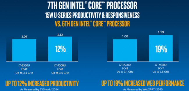 Intel cho rằng bạn sẽ không lãng phí chút nào khi từ bỏ Skylake để đến với KabyLake. Họ sử dụng SYSmark để cho thấy sức mạnh của bộ vi xử lý mang mã hiệu Kaby Lake i7-7500U vượt trội hơn đến 12% so với SkyLake i7-6500U và con số này là 19% khi sử dụng WebXPRT đo vào năm 2015.