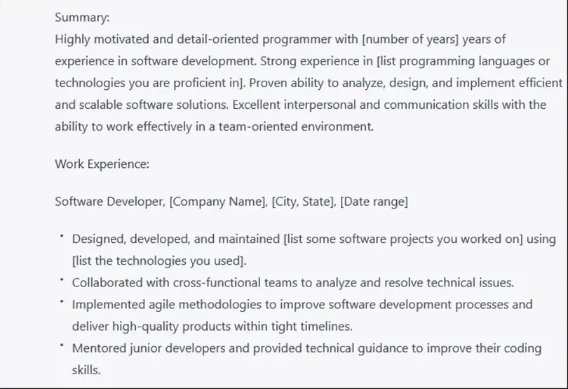 Một lần nữa, viết sơ yếu lý lịch không phải là thứ mà mọi người coi là một hoạt động thú vị. Giống như thư xin việc, bạn sẽ cần xem lại văn bản và chỉnh sửa đôi chút để phù hợp với bản thân mình nhất. ChatGPT thậm chí còn để khoảng trống để bạn điền các thông tin như chức danh, tên công ty và thời gian làm việc.