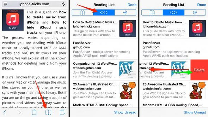 Khi muốn xem lại web đã lưu, bạn chỉ cần bấm vào biểu tượng cuốn sách mở ở cuối màn hình, sau đó bấm vào biểu tượng cặp mắt kính, những trang web bạn lưu sẽ hiện ra. Nếu không thích, chỉ cần vuốt qua trái rồi chọn Delete.