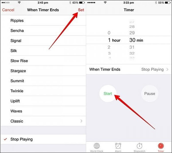 Nếu bạn muốn vừa nghe nhạc vừa ngủ, nhưng lại muốn tự động tắt vào một thời điểm nào đó. Hãy vào ứng dụng Clock, chọn Timer > Stop Playing, rồi chỉnh số thời gian muốn nhạc tắt.