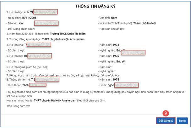 Bước 7 : Hệ thống hiển thị giao diện xác nhận lại thông tin, học sinh/phụ huynh kiểm tra và nhấn “Gửi đăng ký”