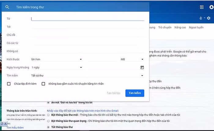 Nhấp vào nút mũi tên xuống nhỏ ở bên phải thanh tìm kiếm để mở bảng điều khiển tìm kiếm nâng cao của Gmail, nơi bạn có thể tìm kiếm theo các bộ lọc như ngày và kích thước tệp đính kèm, dòng chủ đề và các bộ lọc khác.