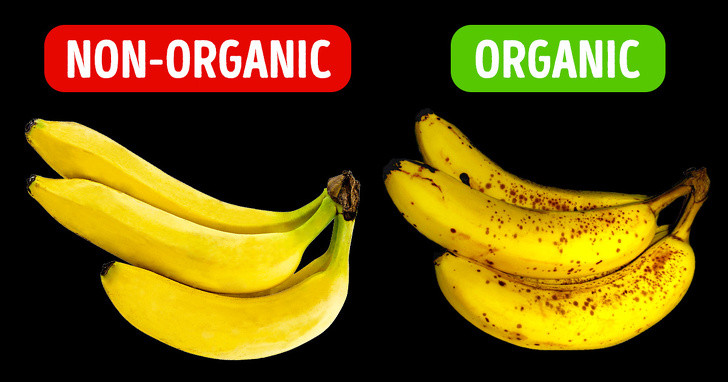 Chuối thông thường thường được sử dụng phân bón tổng hợp, thuốc trừ sâu và thuốc diệt cỏ. Trái cây hữu cơ phát triển hoàn toàn từ các chất tự nhiên. Nhiều người nhận thấy rằng chuối được dán nhãn là hữu cơ thường xuất hiện nhiều vết lốm đốm còn chuối thông thường rất tươi sáng.