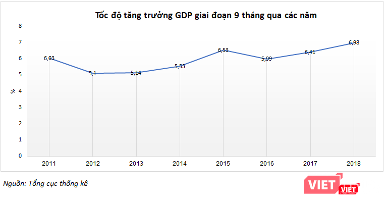Tính chung giai đoạn 9 tháng năm 2018 (9T/2018), GDP ước tính tăng 6,98% so với cùng kỳ năm trước, mức tăng cao nhất của 9 tháng kể từ năm 2011 trở về đây.