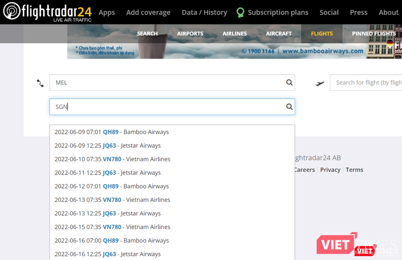 Dữ liệu từ flightradar24.com cho thấy, trong các ngày gần sát thời điểm 7News lên tin (14/6), có 2 chuyến bay của 2 hãng hàng không Việt Nam có các chuyến bay thẳng từ Melbourne về Tp. HCM, là các chuyến VN780 của Vietnam Airlines (ngày 13/6) và QH89 của Bamboo Airways (ngày 12/6).
