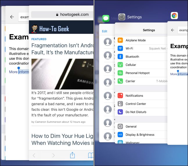 Nhấn mạnh vào cạnh trái màn hình rồi vuốt sang phải để chuyển sang ứng dụng sử dụng trước đó, có thể lặp lại nhiều lần để chuyển qua nhiều ứng dụng. Ngoài ra, cũng có thể nhấn mạnh vào cạnh trái, vuốt sang giữa màn hình rồi thả ra để bật cửa sổ đa nhiệm, từ đây bạn có thể chuyển hoặc đóng một ứng dụng nào đó mà không cần bấm nút Home 2 lần.