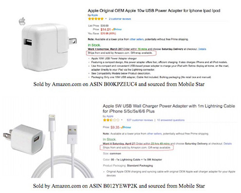 Công ty công nghệ Mỹ khẳng định rằng gần 9 trong số 10 phụ kiện mang nhãn hiệu Apple được bày bán trên Amazon là giả mạo. Chúng có nguồn gốc từ Mobile Star và 50 nhà bán lẻ khác với mục tiêu cung cấp phụ kiện adapter sạc, dây cáp và các loại sản phẩm có thể gây nguy hiểm cho người sử dụng.