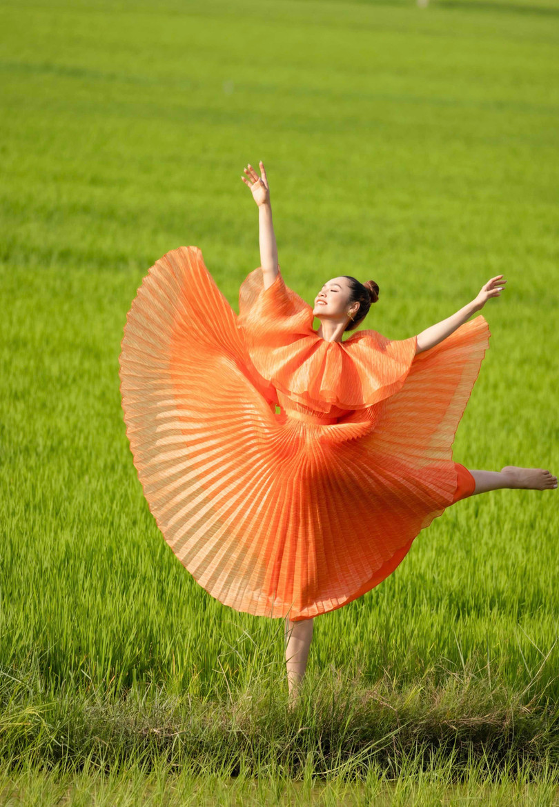Không để lỡ mất những khoảnh đẹp kỳ diệu mà thiên nhiên ban tặng, Á hậu Hoàng My và ekip đã cùng nhau đã ghi lại bức hình với bộ váy xếp ly màu cam vô cùng rực rỡ.