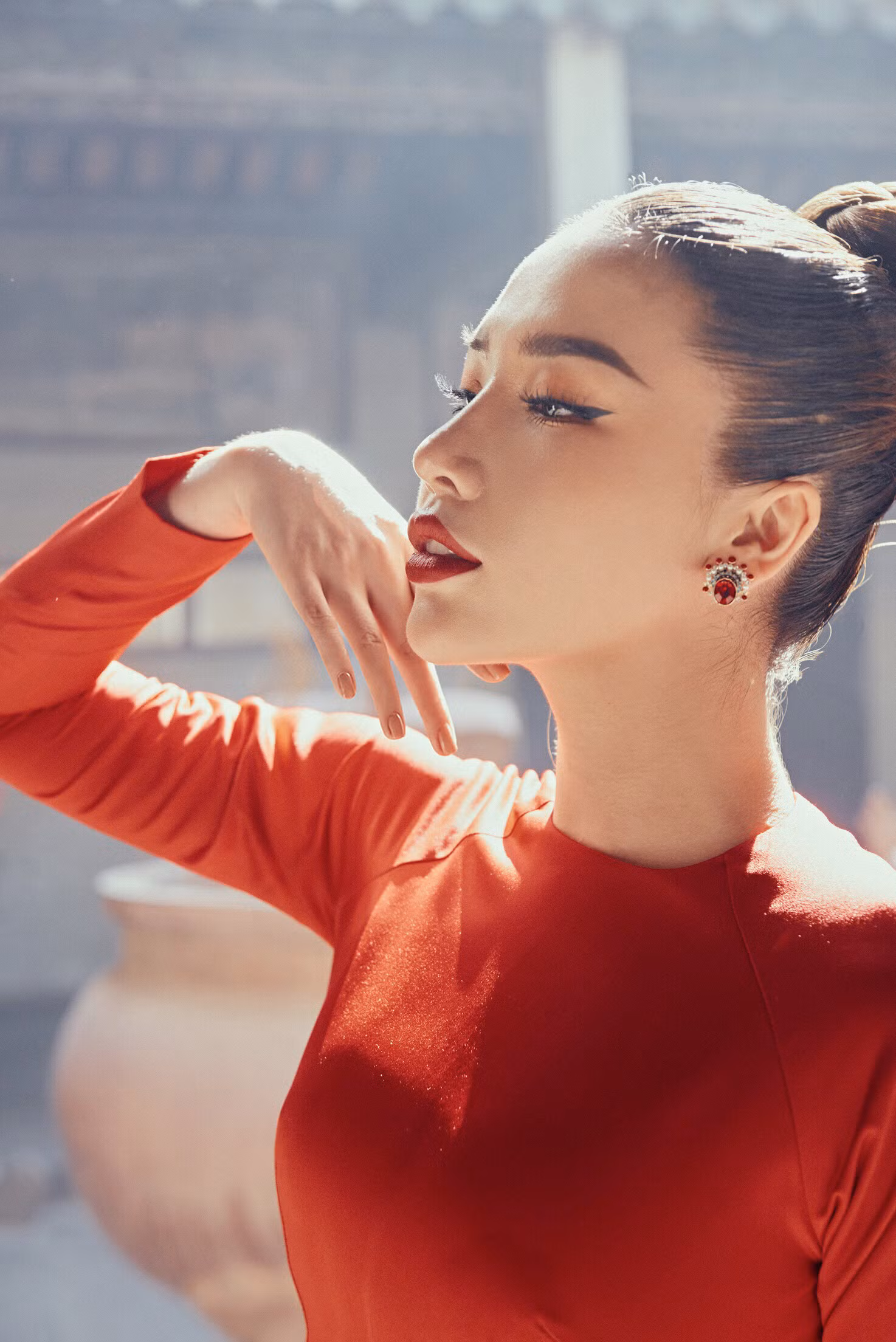 Không chỉ “ăn điểm” bởi lựa chọn áo thanh lịch, cuốn hút, việc để mái tóc búi cao gọn gàng cùng phong cách make up nhấn vào đôi môi gợi cảm và bông tai độc đáo cũng giúp Á hậu khoe vẻ đẹp và “khí chất” ngời ngời.