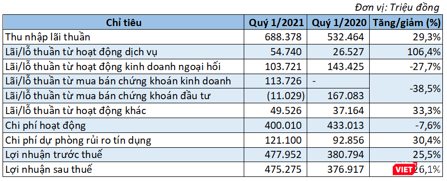 Trong đó, thu nhập lãi thuần đạt 688,3 tỉ đồng, tăng 29,3% so với cùng kỳ năm 2020. Lãi thuần từ hoạt động dịch vụ tăng gấp đôi lên mức 54,7 tỉ đồng và lãi thuần từ hoạt động khác tăng 33,3% lên mức 49,5 tỉ đồng.