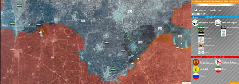 Miền Bắc Hama, sau 2 ngày chiến sự, các chiến binh Hồi giáo thân phương Tây chiếm thị trấn Morek, làng Atshan, Um Harteyn, Kubaybat Al Hada, Dzhanabira và 3 điểm cao chiến lược. Điều đó đã khiến quân đội Syria không thể tạo ra được thế bao vây tiêu diệt. Chảo lửa đã không hình thành.