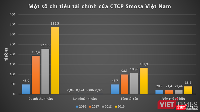 Dữ liệu của VietTimes cho thấy, trong 4 năm trở lại đây, Smosa luôn tăng trưởng mạnh về doanh thu, song lợi nhuận thu được lại rất thấp. Như năm 2019, Smosa ghi nhận doanh thu thuần đạt 335,5 tỉ đồng, báo lãi thuần ở mức 378 triệu đồng, tương ứng với biên lợi nhuận 0,1%.