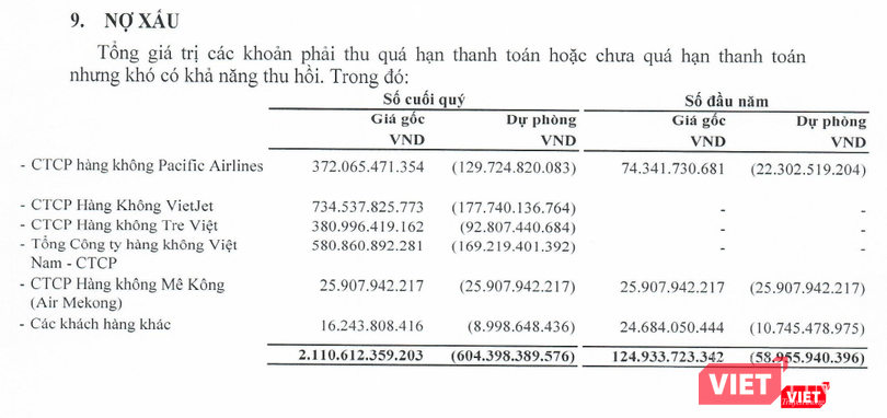 Đồng thời, ACV cũng trích lập dự phòng 604,3 tỉ đồng, tăng gấp 10 lần so với đầu năm, đối với các khoản nợ xấu này, trong đó chủ yếu là các khoản phải thu phát sinh với các hãng hàng không trong nước như: Bamboo Airways, Vietjet, Vietnam Airlines.
