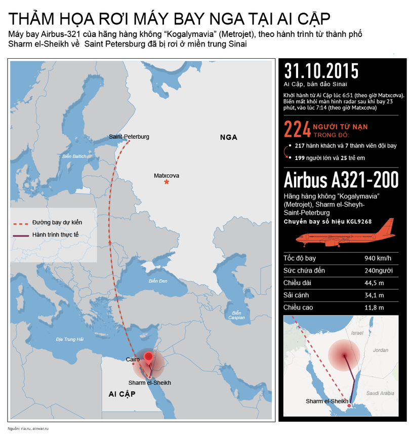 Ngày 31.10.2015, thảm họa hàng không đã xảy ra ở bán đảo Sinai với chiếc máy bay A321 của hãng hàng không Nga Metrojet («Kogalymavia"). Trên máy bay có 217 hành khách và 7 thành viên phi hành đoàn, tất cả đều thiệt mạng.