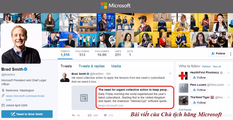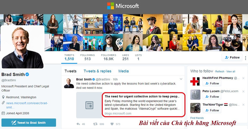 Trong blog cá nhân của mình, chủ tịch hãng Microsoft Brad Smith.Trách nhiệm về sự lây lan virus tống tiền WannaCry một phần thuộc về các cơ quan chính quyền và các đơn vị đặc biệt của tấn cả các nước khác nhau. Ông viết: