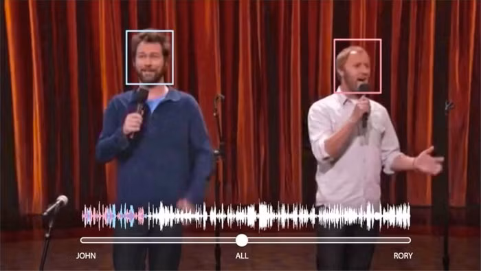 Trong clip dưới đây, bạn có thể quan sát hai diễn viên hài Jon Dore và Rory Scovel đang liên tục bắt chuyện để gây sự chú ý với khán giả, Mặc cho màn trình diễn xuất hiện rất nhiều tạp âm nhưng AI vẫn có thể lọc được trọn vẹn giọng nói của một người bằng cách khoanh vùng khuôn mặt người đó. Ngay cả khi khuôn mặt của diễn viên hài bị tay hoặc micro che khuất, AI vẫn có thể theo dõi và ghi âm như bình thường.