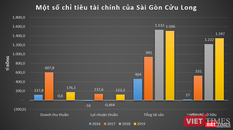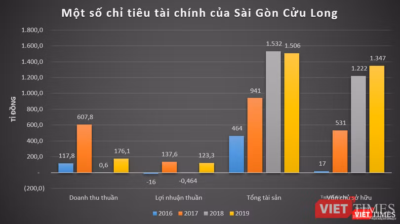 Dữ liệu của VietTimes cho thấy, trong 4 năm trở lại đây, kết quả kinh doanh của Sài Gòn Cửu Long biến động mạnh. Cụ thể, năm 2017, doanh thu thuần của Sài Gòn Cửu Long đạt 607,8 tỉ đồng, cao gấp hơn 5 lần so với năm trước; lãi thuần ở mức 137,6 tỉ đồng, trong khi năm 2016 lỗ 16 tỉ đồng.
