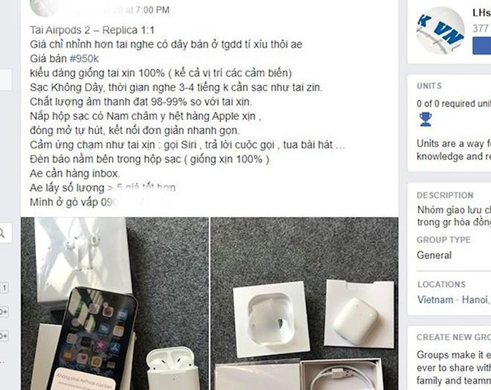 Giữa tháng 10, AirPods 2 hàng “replica” xuất hiện nhiều trên các hội nhóm bán hàng online. Thiết bị này được rao bán với giá từ 780.000 đồng đến 950.000 đồng.