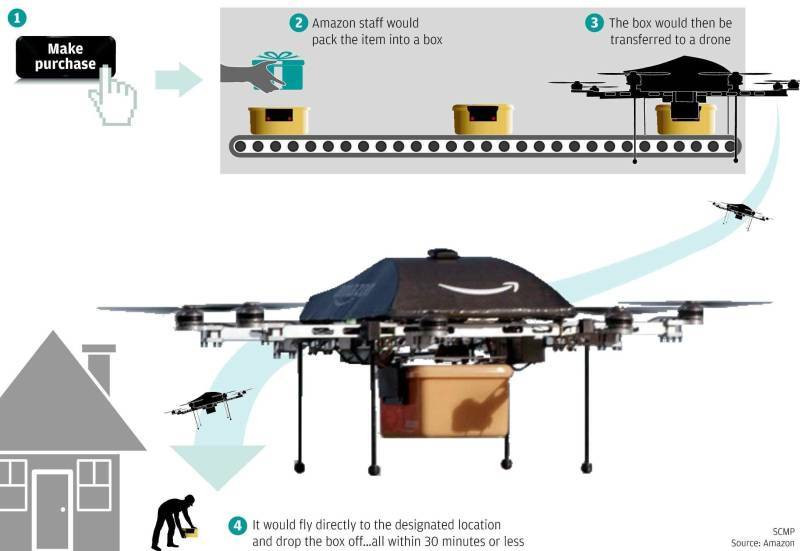 Công ty Amazon, nhà bán lẻ trực tuyến lớn nhất thế giới từ tháng 12.2013 đưa ra phương pháp giao hành nhanh nhất - Amazon Prime Air. Bằng dịch vụ giao hàng này, mọi đơn đặt hàng tại các cửa hàng trực tuyến Amazon, sẽ được giao cho khách hàng trong vòng 30 phút, nhanh hơn so với phương pháp phân phối hàng nhanh nhất hiện nay là Amazon Prime Now 4 lần. Việc đẩy nhanh tốc độ giao hàng được lên kế hoạch sử dụng các máy bay không người lái.