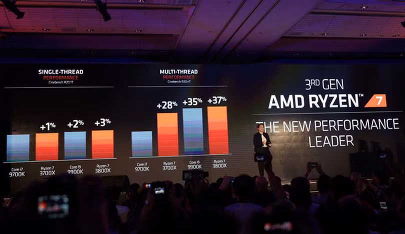 Tại Computex hôm nay, bà Lisa Su - CEO của AMD đã giới thiệu CPU Ryzen thế hệ 3, đây là dòng CPU 7nm đầu tiên trên thế giới dành cho desktop. Tâm điểm của sự chú ý chắc chắn là CPU Ryzen 9 3900X với 12 lõi và 24 luồng xử lý kèm mức giá 499 USD, nó thấp hơn nhiều so với Intel i9-9920X 12 nhân đang được bán với giá khoảng 1.189 USD. Điện năng tiêu thụ (TPD) của Ryzen 9 3900X chỉ là 105W so với 165W của CPU Intel nhưng lại nhanh hơn đến 16% khi render qua phần mềm Blender. Ryzen 9 3900X là lời khẳng định AMD muốn ‘đánh gục’ Intel ở cả hiệu năng, giá trị và hiệu quả.