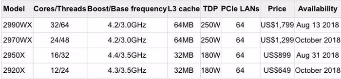AMD cho biết, Ryzen Threadripper 2990WX hiện đã được phân phối ra thị trường toàn cầu. Trong khi đó, các phiên bản thấp hơn sẽ được tung ra trong những tháng tới, cụ thể như sau: Ryzen Threadripper 2950X vào 31/8, Ryzen Threadripper 2970WX và 2920X vào tháng 10/2018.
