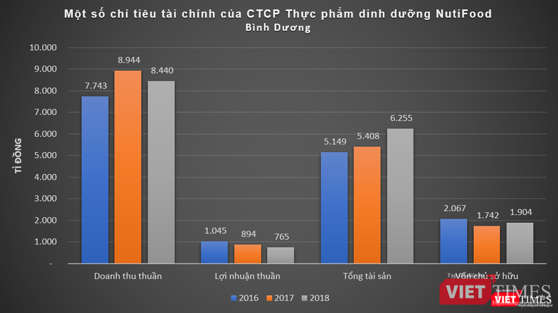 Dữ liệu của VietTimes cho thấy, trong giai đoạn từ năm 2016 – 2018, kết quả kinh doanh của NutiFood Bình Dương có phần sụt giảm nhẹ, tuy nhiên vẫn rất ấn tượng. Năm 2016, doanh thu thuần của NutiFood Bình Dương đạt 7.743 tỉ đồng, lãi thuần ở mức 1.045 tỉ đồng, tương ứng với biên lợi nhuận 13,5%.