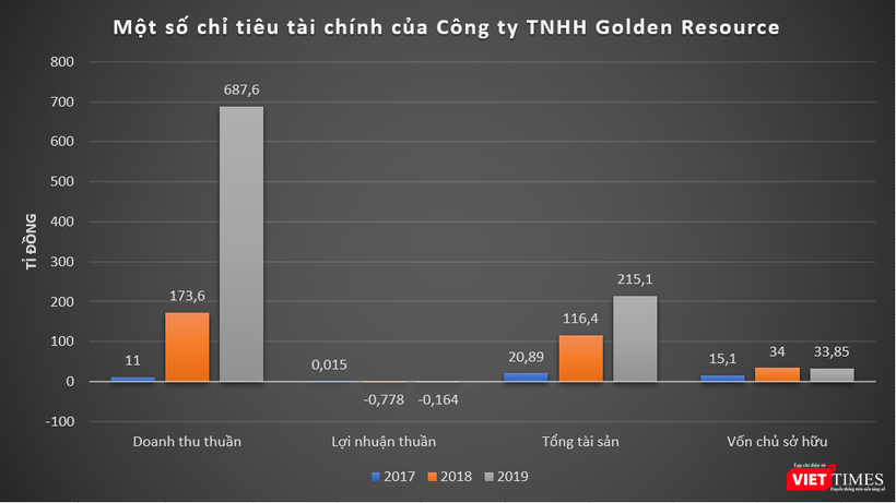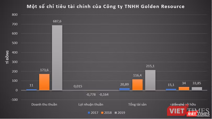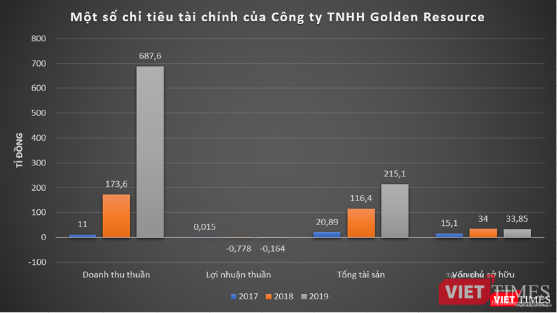 Dữ liệu của VietTimes cho thấy, vài năm gần đây, Golden Resource có kết quả kinh doanh chưa thực sự tốt. Cụ thể, năm 2017 và 2018, công ty này ghi nhận doanh thu thuần đạt lần lượt 11 tỉ đồng và 173,6 tỉ đồng, lợi nhuận thuần ở mức 15 triệu đồng và âm 778 triệu đồng.