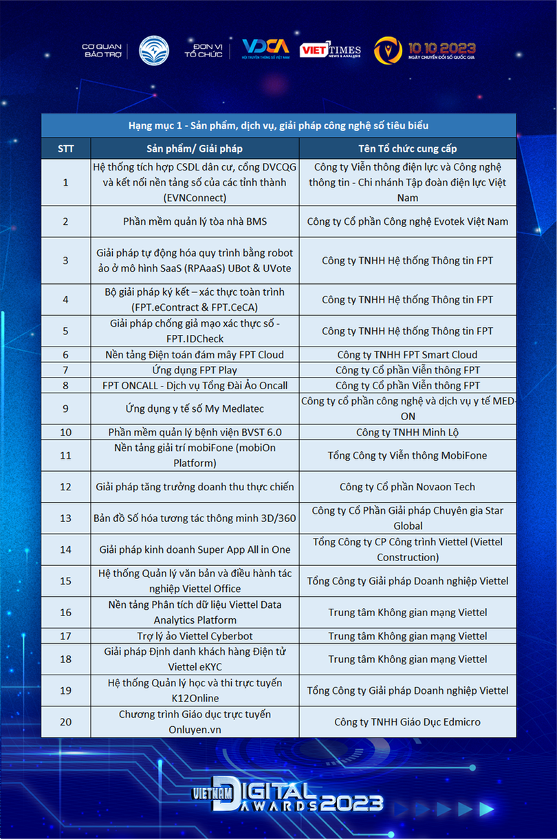 Hạng mục 1: Sản phẩm, dịch vụ, giải pháp công nghệ số xuất sắc (vinh danh 20 sản phẩm, dịch vụ, giải pháp);