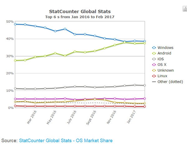 StatCounter, một công ty phân tích web, phát hiện ra hệ điều hành Android đang tiến rất sát đến thị phần của Windows trong tháng vừa qua. Cụ thể, OS di động của Google được 37,4% người dùng để kết nối Internet trong tháng 2/2017, so với mức 38,6% người dùng Windows. Còn iOS của Apple đứng thứ 3 với 12,99%.