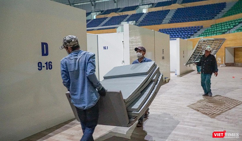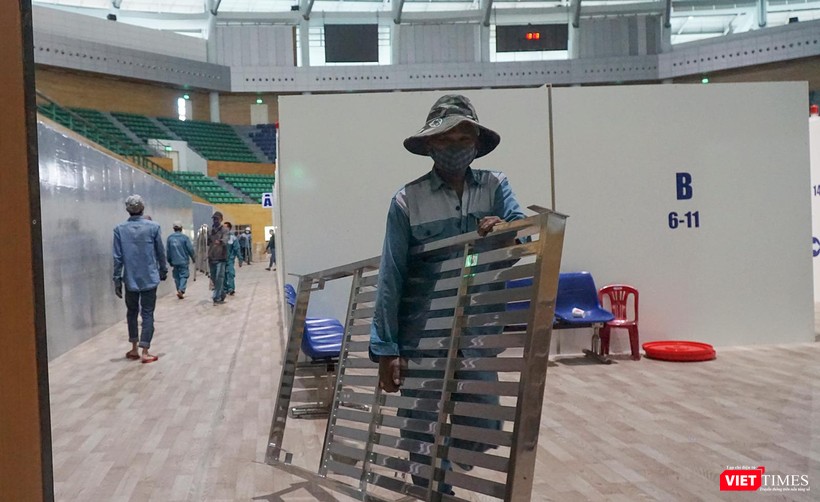 Công nhân đang tháo dỡ Bệnh viện dã chiến Tiên Sơn (Đà Nẵng)