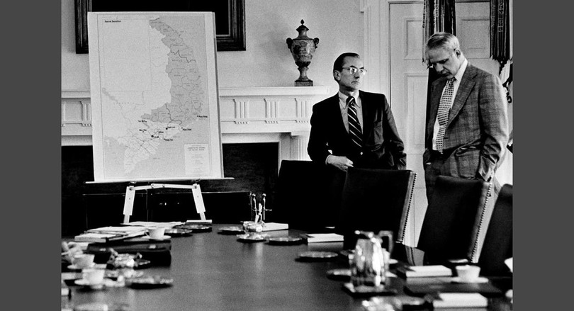 Ngày 9/4/1975: Các lực lượng quân đội Việt Nam đang tiến sát đến Sài Gòn, các vùng miền Trung hoàn toàn thất thủ. Giám đốc CIA William Colby và Bộ trưởng Quốc phòng Jim Schlesinger vô cùng phiền muộn khi tôi chụp ảnh họ trong phòng nội các trước cuộc họp kín về tình hình Đông Dương.
