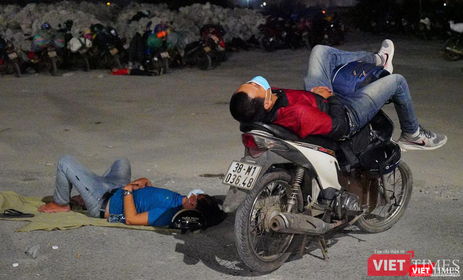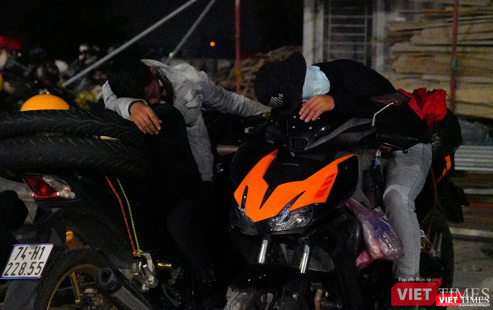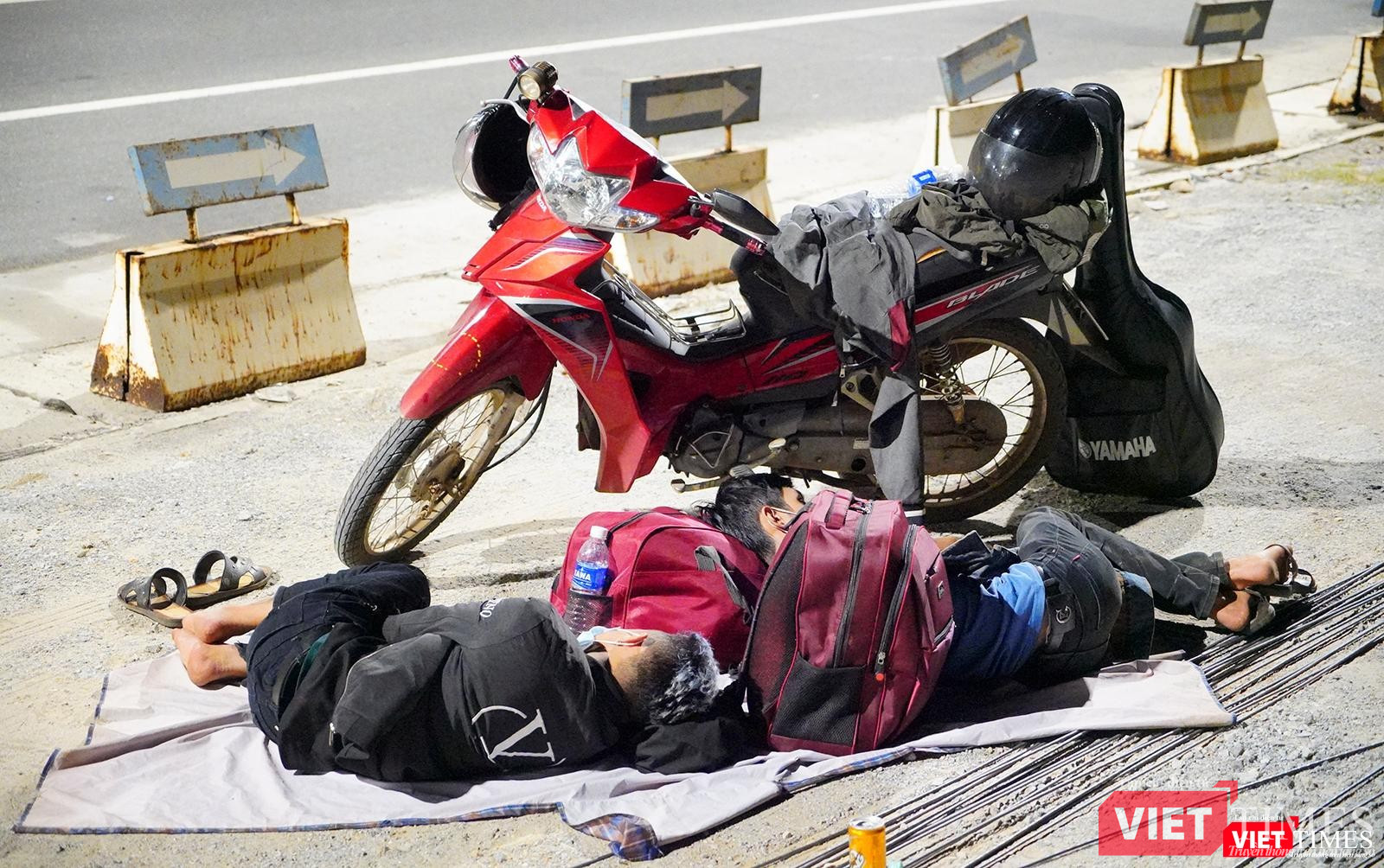 Trong lúc đội tình nguyện bảo dưỡng xe thì người dân tranh thủ ngã giấc sau hành trình dài từ TP HCM về quê